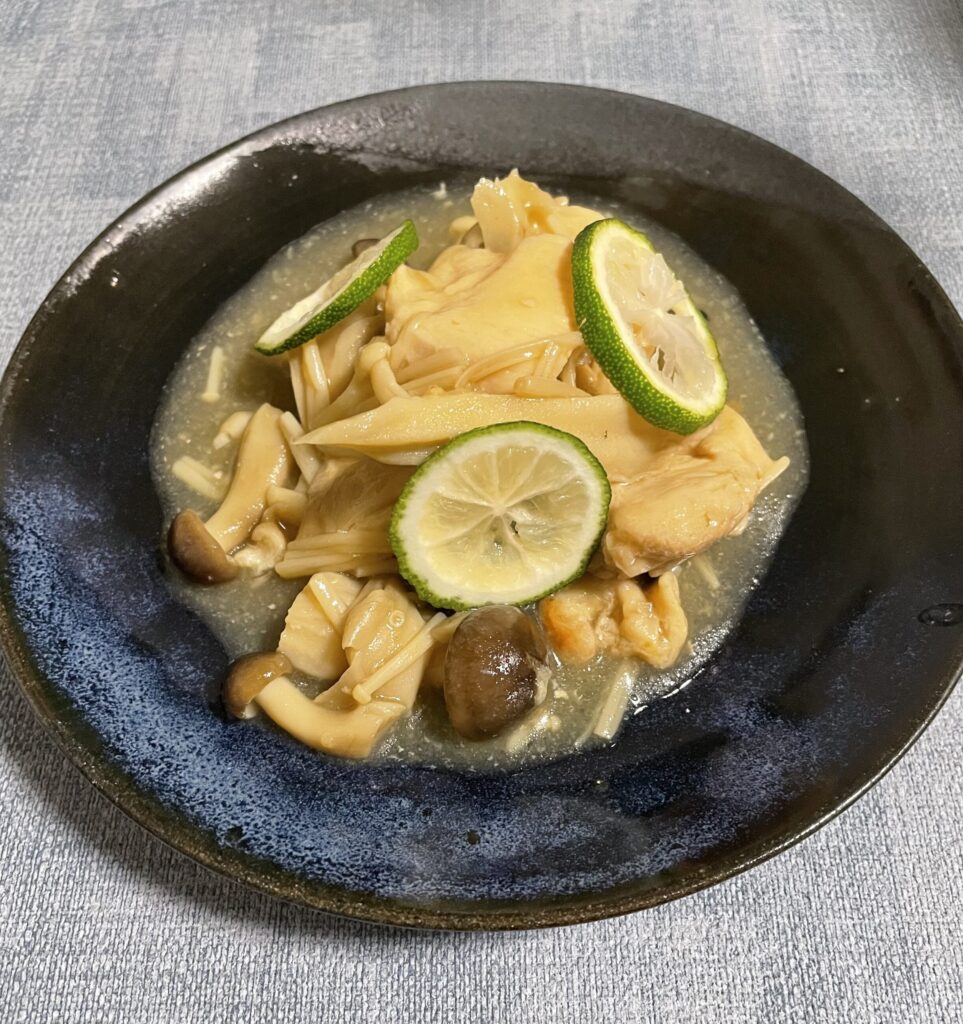 鶏むね肉は高たんぱく・低脂肪で、筋力維持に最適な食材です。きのこの旨味成分とすだちの酸味を上手に使えば、塩分控えめでも美味しく召し上がっていただけます。